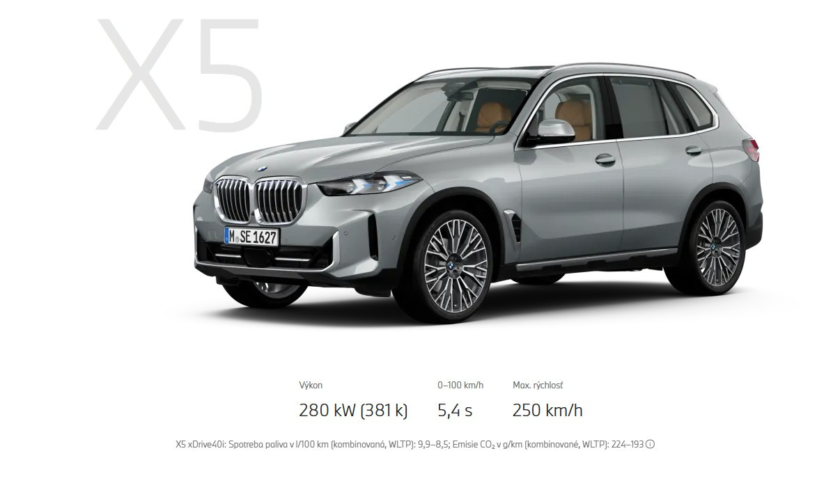 X5 xDrive40i: Spotreba paliva v l/100 km (kombinovaná, WLTP): 9,9–8,5; Emisie CO₂ v g/km (kombinované, WLTP): 224–193
